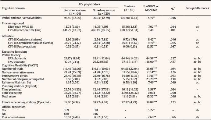 With regard to the first objective, we checked for differences in the neuropsychological performance of the IPV perpetrators groups (with and without substance misuse) and controls. Several significant differences were observed in verbal and non-verbal abilities, F(2, 306) = 5.19, p = .006, p2 = .046, and working memory, F(2, 306) = 4.57, p = .001, p2 = .029. A post-hoc analysis revealed that IPV perpetrators with substance misuse presented worse working memory than controls (t = -2.12, p = .001).