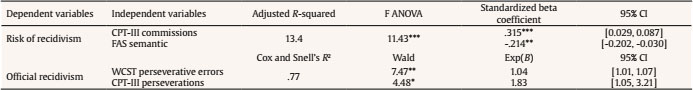 A linear regression model was conducted to assess the main effects of IPV perpetrators neuropsychological functioning on the risk of recidivism. A significant main effect of attention (commissions or false alarms) and verbal fluency (semantic) was found on risk of recidivism, R2 = .134, F(1, 223) = 11.43, p < .001; = .315, t = 3.93, p < .001; and = -.214, t = -2.68, p = .008, respectively (see Table 3). After including group as covariate, attention (commissions) and FAS semantic still predicted the dependent variable, ( = .299, t = 3.61, p < .001, and = -.211, t = -2.62, p = .010).