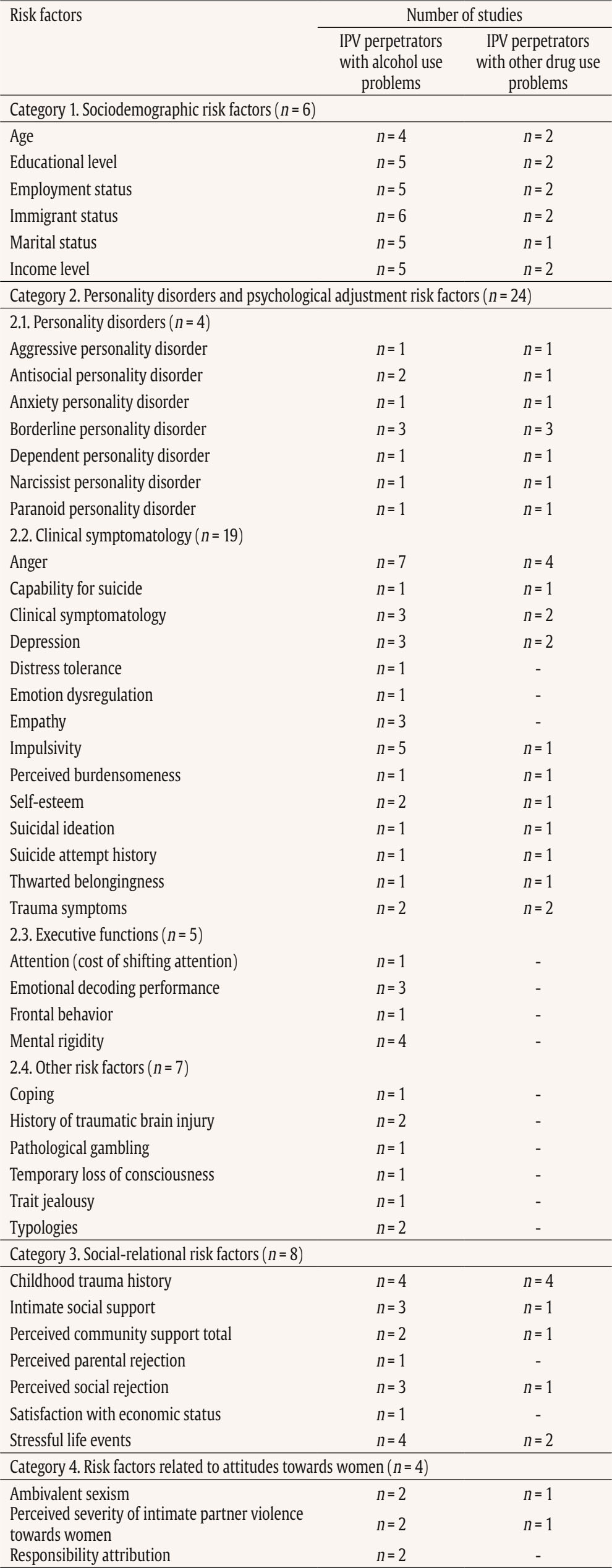 Table 2 displays a summary of investigated risk factors grouped into four main categories: (1) sociodemographic variables, (2) personality disorders and psychological adjustment, (3) socio-relational variables, and (4) attitudes towards women. Risk factors related to personality disorders and psychological adjustment were grouped into four subcategories: (2.1) personality disorders, (2.2) clinical symptomatology, (2.3) executive functions, and (2.4) other risk factors. The number of studies investigating each risk factor is presented separately for participants with alcohol and other drug use problems in Table 2. Where studies measured alcohol and other drug use conjointly (Studies 10, 25, and 26), results were included in both columns for IPV perpetrators with alcohol use problems and for IPV perpetrators with other drug use problems.