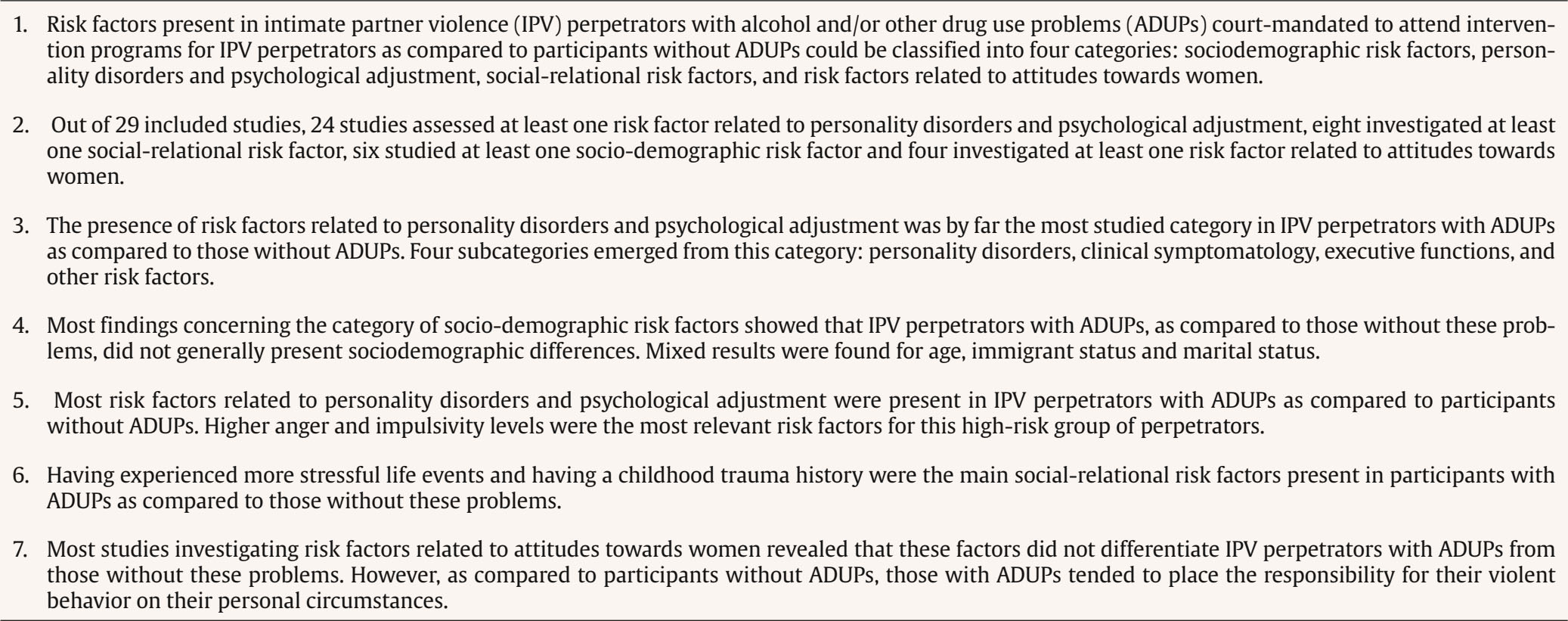 The present systematic review filled this gap by rigorously analyzing the specific risk factors in men with and without ADUPs court-mandated to attend intervention programs for IPV perpetrators. Although there are other types of partnerships that involve IPV (e.g., LGBTIQ+; Badenes-Ribera et al., 2016; Coston, 2021; Gilchrist et al., 2023; Liu et al., 2021; Peitzmeier et al., 2020), the present systematic review focuses on male perpetrators, as IPV is most commonly and severely perpetrated by men against women (Centers for Disease Control and Prevention [CDC, 2022]; WHO, 2013). As far as we are aware, this is the first systematic review to identify the specific risk factors beyond issues strictly related to substance use that differentiate IPV perpetrators with and without ADUPs in court-mandated group-based intervention programs for IPV perpetrators. A better understanding of the main risk factors present in participants with ADUPs on entry to such programs will help inform intervention needs for this high-risk, highly resistant population, which may improve their treatment outcomes (Crane et al., 2016; Massa et al., 2020).