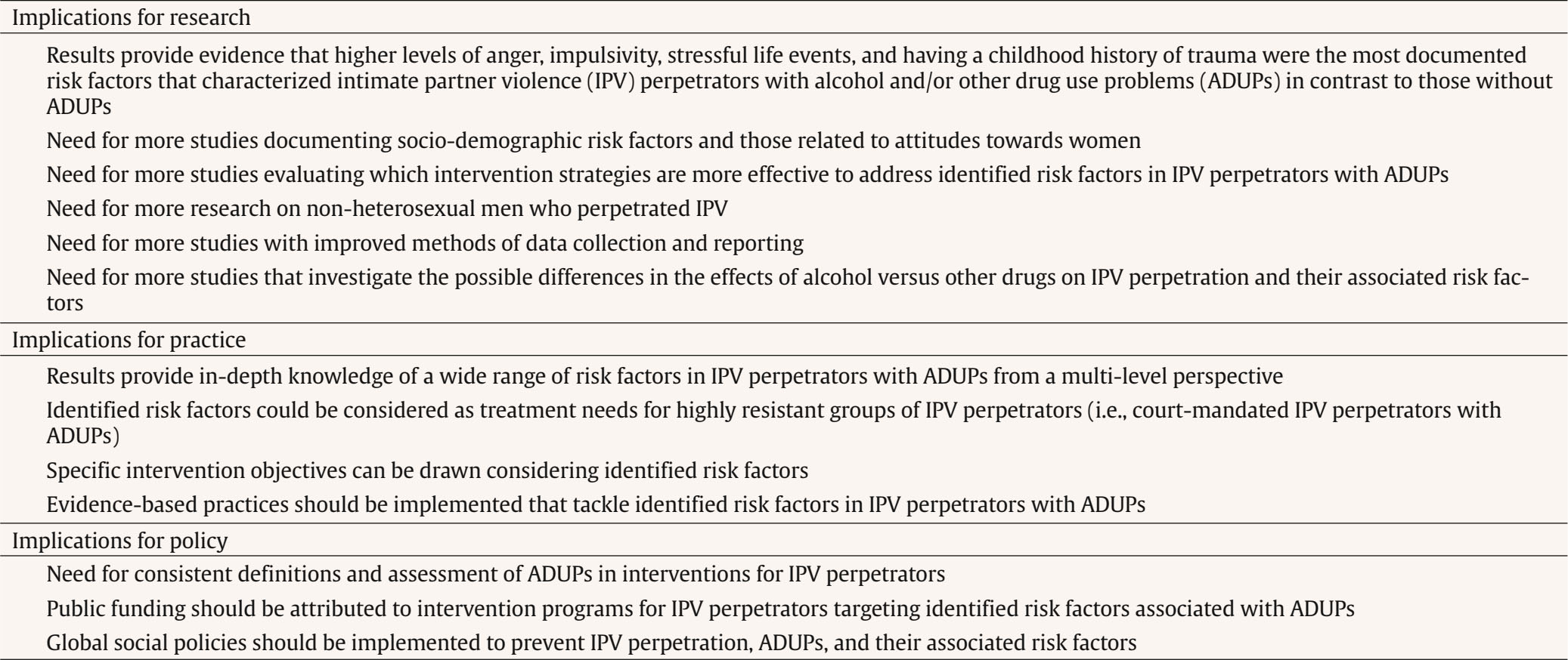 Implications for research, practice and policy are presented in Table 4. The results of this systematic review highlight the importance of screening and identifying a wide range of risk factors in IPV perpetrators with ADUPs structured at different levels. It is essential to develop or improve intervention programs for IPV perpetrators based on the specific needs and identified risk factors of this highly resistant group of perpetrators (Finkel, 2007; Karakurt et al., 2019; Massa et al., 2020). Consistent with the risk-needs-responsivity (RNR) model (Andrews & Bonta, 2010), which strives for adapting intervention programs for IPV perpetrators to individual participants specific needs and matching intervention strategies based on risk factors, there is a need for more individualized approaches to perpetrator treatment that emphasize assessment, motivation enhancement, and interventions targeting mental health and substance use (Butters et al., 2021, p.399). For example, motivational strategies such as setting self-determined goals to establish and monitor individualized intervention objectives, including those related to ADUPs and identified risk factors (e.g., reducing my anger levels during partner conflict) have shown promising results in intervention programs for IPV perpetrators (Lila et al., 2018; Pinto e Silva et al., 2022; Santirso et al., 2020). To further address identified risk factors, for instance, a trauma-informed approach would be recommended for IPV perpetrators with co-occurring ADUPs, a history of childhood trauma and psychological symptomatology (Gilchrist et al., 2019; Karakurt et al., 2019; McKenna & Holtfreter, 2020). Similarly, assessing and identifying each participants risk factors could help facilitators develop concrete exercises adapted to IPV perpetrators needs (Leonard & Quigley, 2017; Massa et al., 2020). For example, those perpetrators with higher levels of aggressive or antisocial personality disorder could benefit from completing exercises that provide information and reflection on healthy relationships, and that helps them to realise that their aggressive behaviours damage their potential to meet their own needs (Babcock et al., 2016). Overall, monitoring identified risk factors and implementing evidence-based practices that address them could improve participants outcomes and help to reduce IPV perpetration. Finally, public funding should be attributed to intervention programs for IPV perpetrators that address documented risk factors for high-risk perpetrators with ADUPs. Global social policies aiming to prevent IPV perpetration (e.g., prevention initiatives focused on reducing tolerant attitudes towards violence against women), ADUPs, and their associated risk factors while promoting mental health are also crucial.