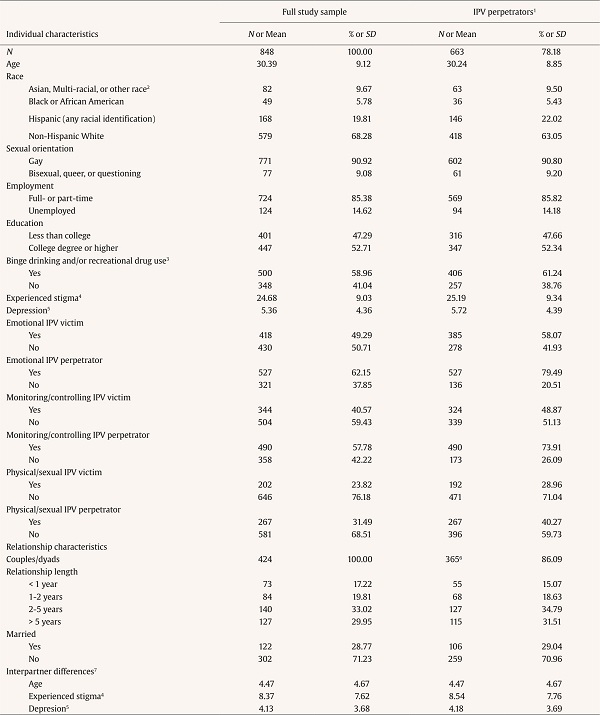 The study population’s sociodemographics and IPV reports are presented in Table 1. The majority of the sample was non-Hispanic White, employed, had a college degree, self-identified as gay, and reported binge drinking and/or using recreational drugs in the previous 3 months. Over 80% of the study’s couples had been together for at least 1 year and slightly more than two-thirds of the study’s couples were married. Forty-five percent, 45.40%, and 20.05% of the sample were categorized as emotional, monitoring/controlling, and physical/sexual IPV perpetrators, respectively. Of the 848 analyzed individuals, 185 (21.80%) were not categorized as IPV perpetrators of any kind, i.e., they neither self-reported perpetration nor did their partner report victimization. Within the 663 identified perpetrators, sociodemographic characteristics were similarly distributed to the full study sample.