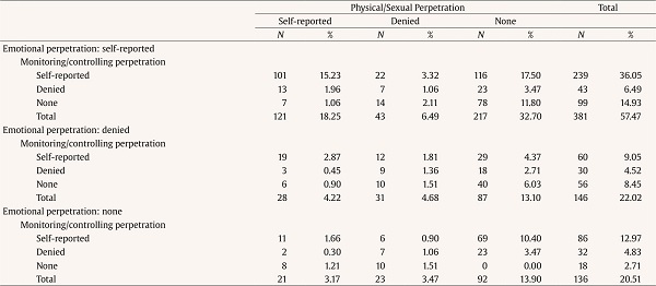 Table 2 presents the perpetration-reporting and denial patterns and overlap, by IPV domain. Emotional IPV perpetration had the highest prevalence, representing 79.49% (n = 527; 101 individuals and 214 dyads) of the sample, closely followed by monitoring/controlling (n = 490 (73.91%); 110 individuals and 190 dyads). Physical/sexual IPV perpetration was the least common type in the study (n = 267 (40.27%); 87 individuals and 90 dyads). Conversely, physical/sexual IPV perpetration was denied to a greater extent than the other types; 36.33% (n = 97) of identified physical/sexual perpetrators did not self-report their behavior. Among all perpetrators, 546 (82.35%) self-reported at least one type of perpetration and of these, 71.43% (n = 390) did not contradict any of their partner’s reported victimization experiences, regardless of type. Conversely, 41.18% (n = 273) of identified perpetrators denied at least some of their perpetration—57.14% (n = 156) of these men self-reported at least one type of perpetration and denied at least one other; and 42.86% (n = 117) denied all perpetration.