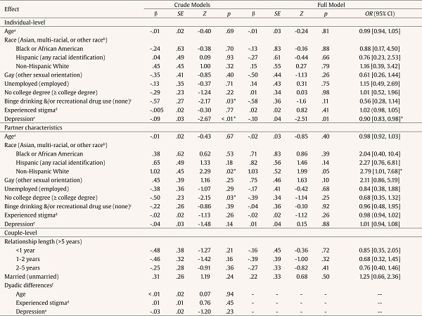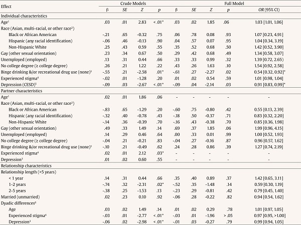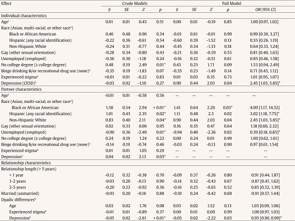 Individual, partner, and couple characteristics that have been associated with IPV perpetration and/or perpetration reporting in GBMSM populations were analyzed as independent variables (race/ethnicity, sexual orientation, education, employment, substance use, depression, and experienced homosexual stigma). Race and ethnicity were combined into a single variable, as multivariate models did not converge without combination. Participants reported their sexual orientation as either gay/homosexual, heterosexual, bisexual, queer, questioning, or other—this was dichotomized as gay and bisexual, queer, or questioning, based on the small proportion of individuals who did not self-identify as gay/homosexual (9.08%). Dichotomized substance use was constructed according to self-reported binge drinking (> 5 drinks on at least one occasion in the previous 3 months) and/or recreational drug use (any use in the past 3 months). Experienced homosexual stress/stigma was measured with the Heterosexist Harassment, Rejection, and Discrimination Scale (HHRDS) scale (Szymanski, 2006) and depression was assessed using the CESD-11 Iowa form (Kohout et al., 1993). At the couple-level, marital status and relationship length were assessed, and dyadic differences in age, experienced stigma, and depression were constructed by subtracting partner-values from self-reported data.