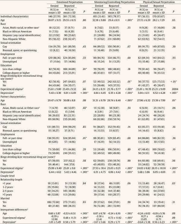 According to bivariate analyses, monitoring/controlling perpetration deniers were significantly older, less likely to have reported recent binge drinking and/or recreational drug use, and had lower reported experienced stigma and depression than their counterparts who reported perpetrating monitoring/controlling IPV (p ≤ .01). In addition, monitoring/controlling perpetration deniers’ partners were significantly older, more depressed, and had higher experienced stigma than self-reported perpetrators’ partners (p < .001).