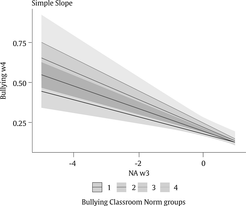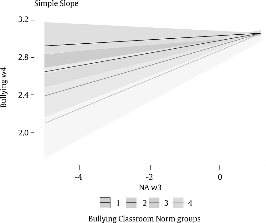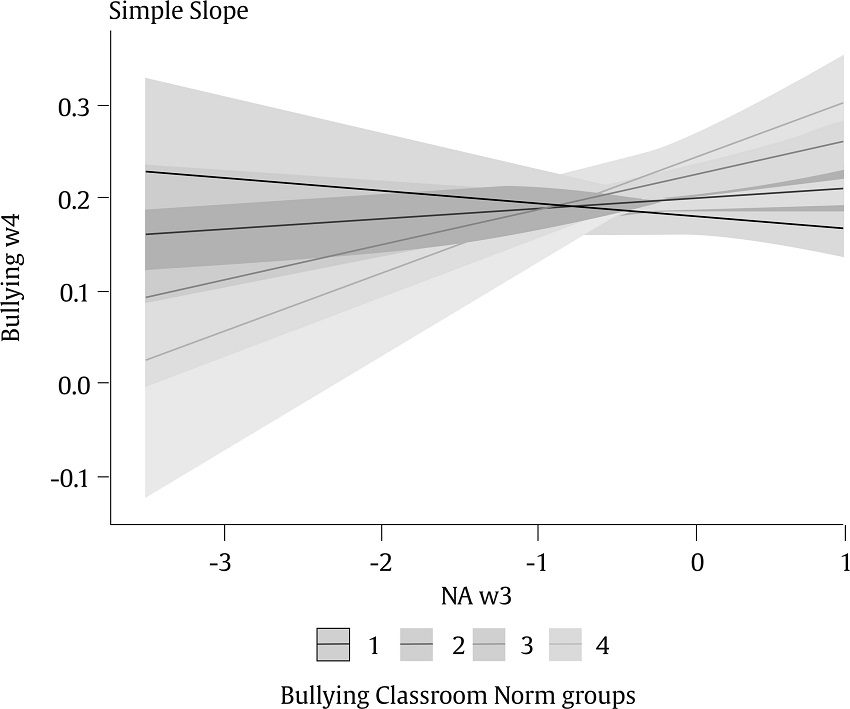 The interaction between bullying classroom norm groups and normative adjustment was significant for bullying (β = -.043, p = .029) and defensive behaviour (β = .05, p = .006), whereas the interaction with pro-social skills was only significant for bullying behaviour (β = .052, p = .015; see Table 4). The results of the simple slope analysis showed a negative association between bullying and normative adjustment for the four bullying classroom norm groups (anti-bullying: β = -.05, SE = .01, t = -4.85, p < .001; anti-bullying but not actively defending: β = -.07, SE = .01, t = -8.69, p < .001; indifferent: β = -.08, SE = .01, t = -7.9, p < .001; and pro-bullying: b = -.10, SE = .02, t = -6.08, p < .001, see Figure 2). Meanwhile, the results of the simple slope analysis showed a positive association between defending and normative adjustment for three of the bullying classroom norm groups (anti-bullying: β = .02, SE = .03, t = 0.8, p = .43; anti-bullying but not actively defending: b = .07, SE = .02, t = 3.74, p < .001; indifferent: b = .11, SE = .02, t = 4.66, p < .001; and pro-bullying: β = .16, SE = .04, t = 4.22, p < .001; see Figure 3). Lastly, the results of the simple slope analysis showed a positive association between bullying and pro-social skills for two of the bullying classroom norm groups (anti-bullying: β = -.01, SE = .01, t = -0.94, p = .35; anti-bullying but not actively defending: β = .01, SE = .01, t = 1.11, p =.27; indifferent: b = .04, SE = .01, t = 2.63, p = .01; and pro-bullying: b = .06, SE = .02, t = 2.86, p < .001; see Figure 4).