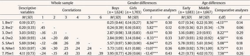 Gender was coded as a binary variable (0 = boys, 1 = girls), and age was categorized in two groups, the first group comprised students from 9 to 13 years old (early adolescence), while the second group comprised students from 14 to 17 (mid-adolescence) (Garrison & Felice, 2009; World Health Organization, 2014).