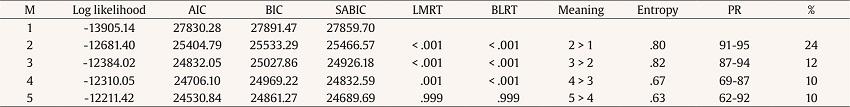 Model fit statistics are shown in Table 2. The five-class model solution showed non-significant LMRT and BLRT values, which means that a less parsimonious model (more k-classes) would not be significantly better than the previous one, that is the more parsimonious model (fewer k-classes). Moreover, the entropy value was worse than for the 4-classes model. In summary, the 4-classes model was the final solution chosen.