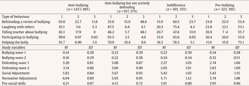 This study used LCA to analyse whether the perceptions of group norms towards bullying allow different types of groups to be formed and how these norms, together with the variables of social and normative adjustment and pro-sociality, influence and interact with the probability of fostering aggressive and defensive behaviour in bullying.