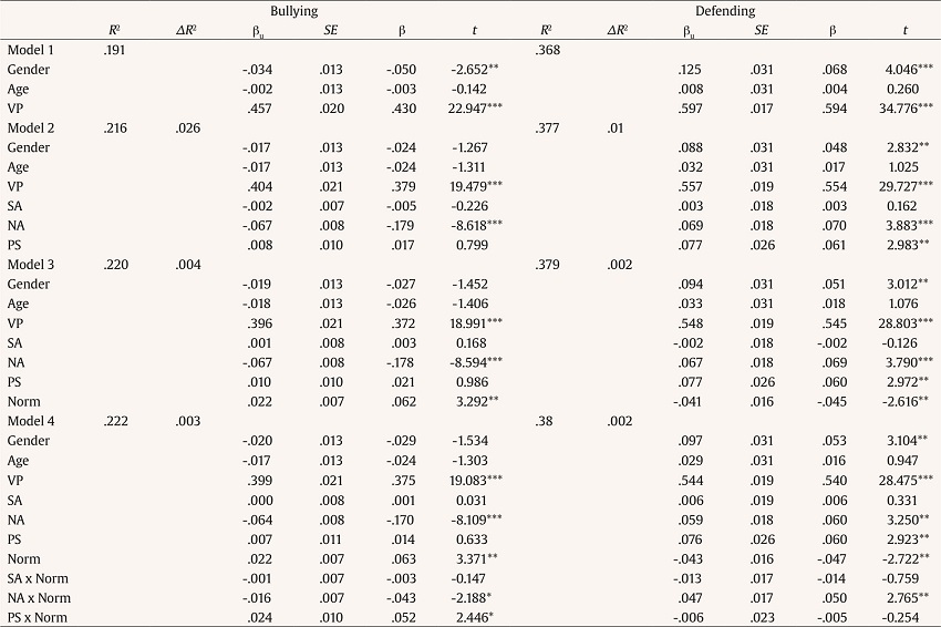 To simplify the reporting of the study results and given that the models were replicated separately for bullying and defensive behaviour, only the results of multivariate MLRA step 4 are summarized below, F(2, 1887) = 343.111, Wilks’ λ = .733, p < .001, with h2 = .27. The levels of significance or non-significance of the variables were maintained throughout the successive steps. Specifically, gender but not age, showed a significant association with the dependent variables, with both dependent variables showing a significant association at the previous time. In addition, all three independent variables and the type of bullying classroom norms showed significant associations with the dependent variables. Finally, the interaction between all three and the bullying classroom norms was also significant.
