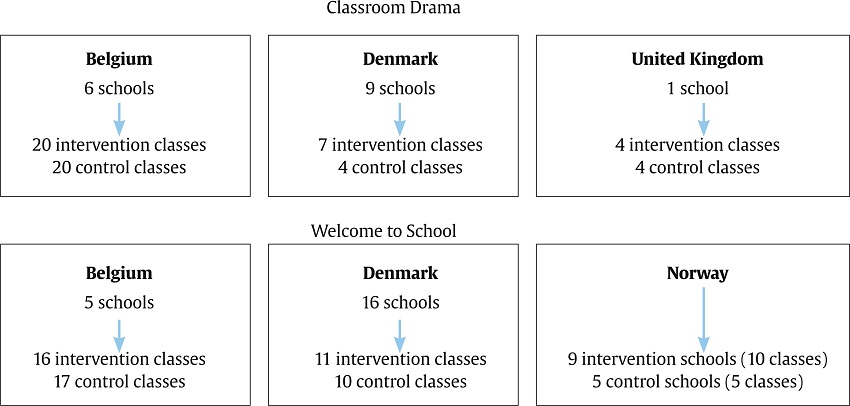 This study forms part of the larger RefugeesWellSchool (RWS), a European Horizon2020 study investigating the effectiveness of different school-based psychosocial interventions in schools in six European countries through mixed quantitative and qualitative research methodologies. The present study concerns a quantitative evaluation of Classroom Drama (CD) (Equipe Théâtre Pluralité d’Erit, 2010), implemented in Belgium, Denmark, and the UK, and of Welcome to School (WTS) (Pharos, 2015; Tuk & de Neef, 2020a), implemented in Belgium, Denmark, and Norway. The implementation of the interventions and data collection within the RWS study occurred between January 2019 and October 2020. As such, the study was heavily affected by the outbreak of the Covid-19 pandemic and related public health measures, including the international closing of schools from March 2020 onward. This method section provides further detailed descriptions of the way Covid-19-related school closures impacted both the delivery of the interventions and the process of data collection in all four countries.