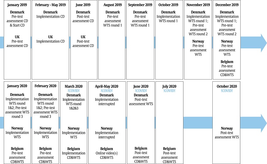 Covid-19-related school closures affected the implementation of WTS, planned in all three countries during the spring of 2020. Most schools and classes were about halfway implementing WTS when schools closed. All three national research teams discussed the possibility of an online continuation of the intervention with schools and teachers but in none of the countries, such a scenario was deemed feasible. The Belgian research team collaborated with WTS teachers to create a short video expressing their support and continued connection to the intervention that was sent to all students receiving the intervention. One school in Norway and five classes in Belgium provided a closing WTS session after schools reopened in June 2020.