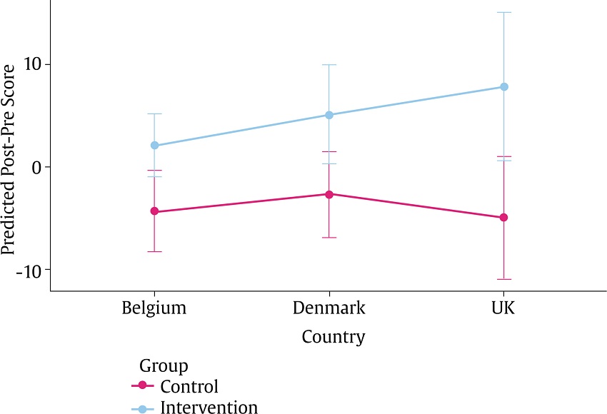 In addition, the group-by-country interaction in Model 6 was significant for “friend support”. Post-hoc analysis detected a significant, large difference (d = 1.19) between the intervention group and the control group in the UK in “friend support” (t = 3.10, df = 27, p = .04), in that the intervention group showed a non-significant increase (mean difference = 7.70, p = .06) whereas the control group showed a non-significant decrease (mean difference = -5.13, p = .06). Figure 3 illustrates this group-by-country interaction. No other statistically significant differences were identified in other countries. Model 6 also revealed a significant group-by-country interaction for school belonging, though post hoc analysis did not detect any significant pairwise differences.