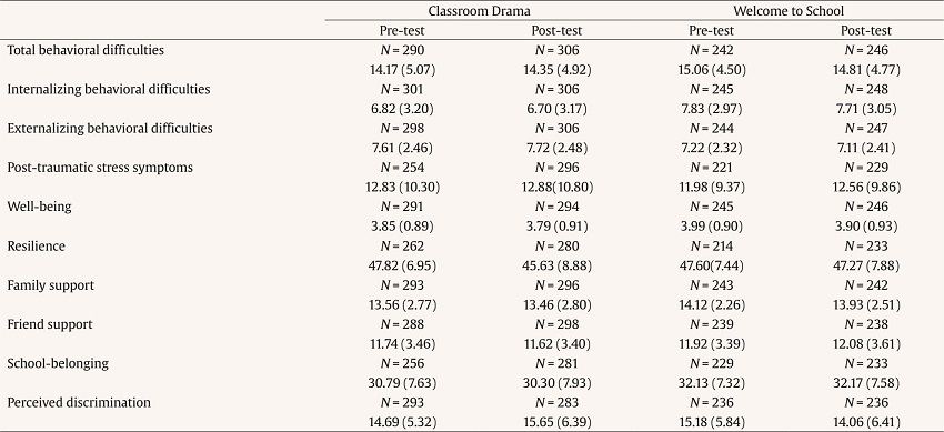 This study aimed to contribute to the existing evidence base on school-based psychosocial interventions while addressing these gaps identified by scholars in the field. Thereto, we implemented two school-based psychosocial interventions, Classroom Drama and Welcome to School, in four European countries. Adhering to a cluster randomized design in two samples of 307 (Classroom Drama) and 251 (Welcome to School) adolescents, we examined the interventions’ effectiveness. Thereby, we paid attention not only to the effect of the interventions on young refugees’ and migrants’ mental health, but also to their potential impact on young people’s resilience and social relations, both in school and at home. Rooted in existing literature, as well as the design and aims of the two interventions, we hypothesized both interventions to be effective in improving refugees’ and migrants’ mental health, supporting their resilience, and promoting more positive social relations.