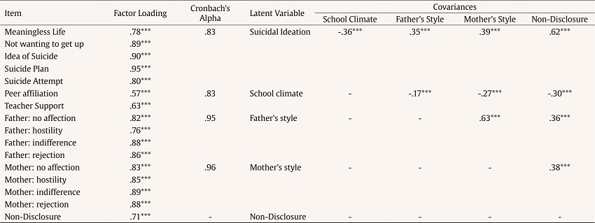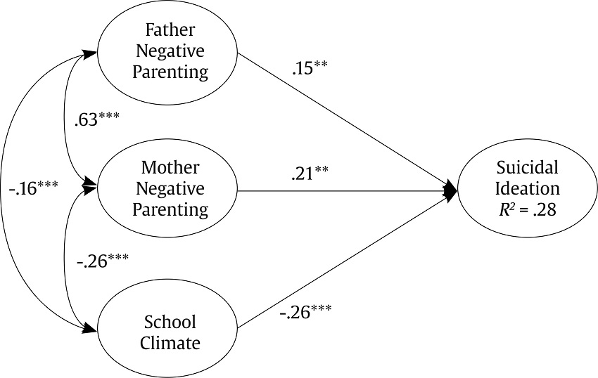 In this phase of the study, the adequacy of a complete measurement model for the proposed constructs was identified: factor loadings, Cronbach’s alpha, and covariances between latent variables in the measurement model are shown in Table 2. Factor loadings are high and significant for all the items (p < .001): above .75 in the five items of suicidal ideation, .57 or more in school climate, above .75 in father’s style, and .80 in mother’s style. The reliability coefficients were higher than .80 for all the latent variables. This model showed an optimal fit (χ2 = 146.85, df = 94, CFI = .96, TLI = .95, RMSEA = .03 [.020, .039], SRMR = .05).
