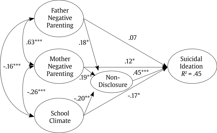 The introduction of the mediating variable non-disclosure reduced the direct influence of the three variables on suicidal ideation. On the one hand, the significance of the direct relationship between the father’s negative parenting style and suicidal ideation was annulled, and, on the other hand, the mother’s negative parenting style (β = .12, p < .05) and school climate (β = -.17, p < .05) again showed significant direct relationships with suicidal ideation.