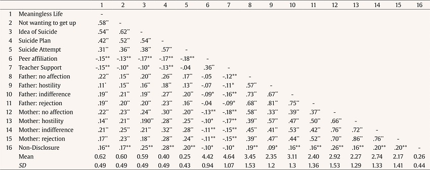 The correlation matrix, means, and standard deviation of each observable variables considered in this study are shown in Table 1. All the indicators of the suicidal ideation construct showed significant correlations with the rest of the variables in the expected direction.