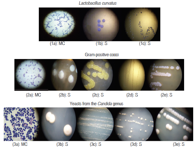 Figure 1 shows gram staining micrographs for Lactobacillus curvatus, gram positive cocci and the Candida famata, Can. magnoliae, Can. krusei/incospicua and Can. sphaerica yeasts. These micrographs were taken with an optical microscope and a stereoscope.