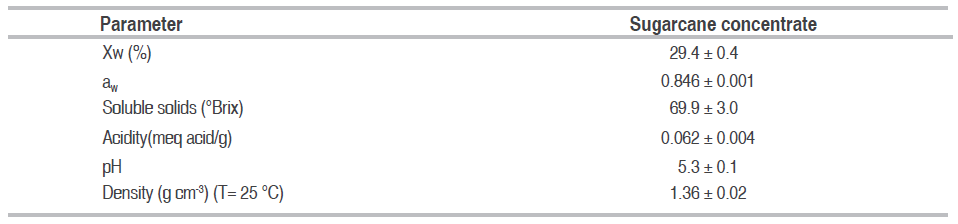 Table 1 shows the mean values and standard deviations of the sugarcane concentrate used in the fermentation process. The sugarcane concentrate was obtained as an intermediate product of the jaggery manufacturing process during the final stage of juice concentration and prior to the mixing and molding of the product (Osorio, 2007). This concentrate has an important content of soluble solids provided mainly by sucrose, glucose and fructose (Wisuthiphaet and Napathorn, 2016). Moreover, its Xw and aw identified this substrate as susceptible to microbial activity, which is favored by its acidity and pH conditions. Information on sugarcane concentrate is scarce in the reviewed literature, but some studies stand out: Largo et al. (2015), reported findings on sugarcane concentrate at 48.6 °Brix, an Xw: 41.0; a.: 0.962; pH: 5.7; acidity: 0.026%; Naranjo (2008) obtained similar values for density (1.35 g cm-3) and Xw (30%) with sugarcane concentrate at 70 °Brix.