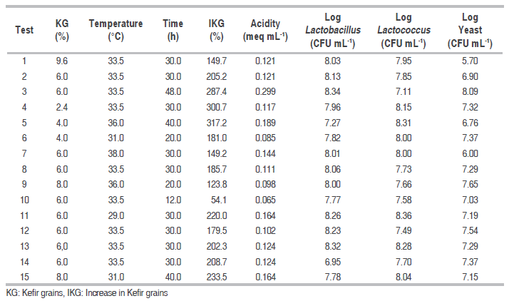 The optimization of the fermentation process was performed using the response surface methodology based on a central composite experiment design (15 experiments). In addition, three factors or independent variables were considered: added KG (2.4-9.6%) (Factor A), fermentation temperature (29-38 °C) (Factor B) and fermentation time (12-48 h) (Factor C). The response or dependent variables were: Increase in Kefir grains (IKG) (%) (to be maximized), acidity (meq acid mL-1) (to be minimized) and lactobacilli, lactococci and yeast counts (to be maximized). The statistical analysis of the results was conducted with the Design Expert 8.0, software, State-Ease, Inc., additionally, an analysis of variance (ANOVA) with a level of significance of 5% was conducted. The regression analysis and the relationship between the independent and dependent variables were calculated using a second order polynomial model.