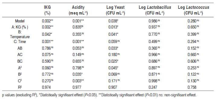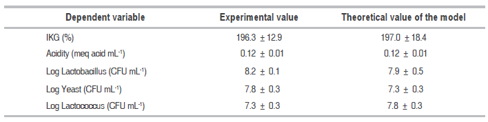 The optimization of the fermentation process using the Design Expert 8.0 software was performed by maximizing both the IKG and the microbial counts while keeping the acidity levels within the experimental range, thus generating the following optimal conditions for fermentation: KG = 6.0% (w/w), temperature = 33.5 °C and time = 30 hours. Table 4 shows the values obtained experimentally using the optimal process conditions and the theoretical values from the models for each variable. The ANOVA (Table 3) showed that the factorial regression model was statistically significant (.<0.05) for the IKG, acidity (meq mL-1) and log yeast (CFU mL-1) response variables. The regression coefficients for the quadratic model were 97.4%; 97.7% and 90.4% respectively. In contrast, no statistically significant differences (.>0.05) were observed for the other dependent variables, factors or interactions within the studied range.