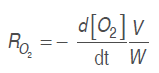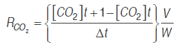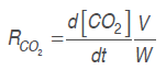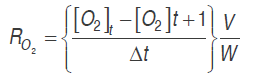 (2)Where RO2 and RCO2 are the respiration rates (mL kg-1 h-1), [O.] and [CO.] are oxygen and carbon dioxide concentrations, . is time (h), Δ. is the time between the two measures of the respective gas, . is the free volume in the respiration chamber (mL), and . is the cut fruit mass (kg).