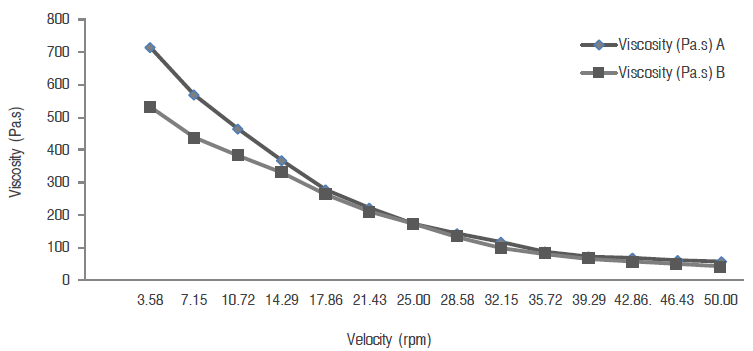 The instrumental viscosity of cheese A and B can be seen in figure 1.