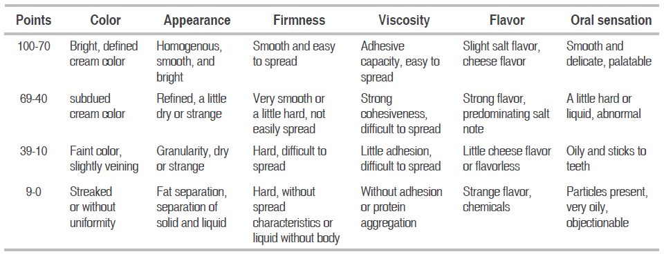 The characteristics of firmness, viscosity, and flavor presented significant differences (.?0.05) for A and B. The former was firmer and was difficult to spread despite having compositional and physicochemical characteristics that are typical for cheese spreads. On the other hand, B was easy to spread. This phenomenon can be explained by the fact that cheese A was produced using fresh cheese and, in this cheese, the casein was not significantly hydrolyzed, resulting in a harder, firmer product with noticeable stretched characteristics, with a low capacity for being spread and a high emulsifying capacity (Piska and Stetina, 2004); whereas, the evaluated commercial cheese obtained from a mixture of mature cheese had a smooth, spreadable, and short structure (Guinee, 2004;Bunka et al., 2013).