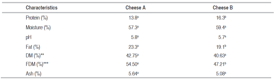 The results obtained for the A and B cheeses are in table 3. The moisture, pH, total solids and ash did not present significant differences (.?0.05).
