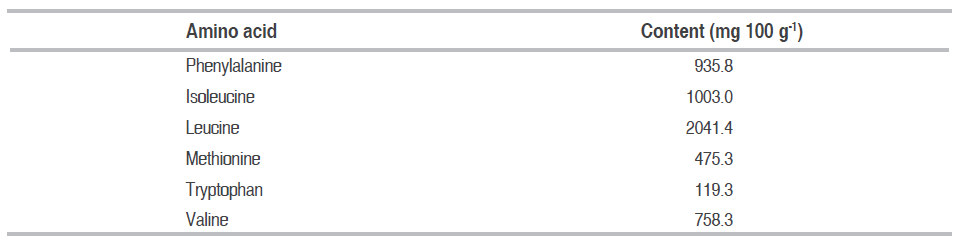 The product had a significant essential amino acid content for the diet of consumers and was similar to the findings of El-Shazly et al. (2010) for a cheese spread, who obtained, in mg per 100 g of product, 1104 for phenylalanine, 725.92 for isoleucine, 1584 for leucine, 445.2 for methionine, and 768.72 for valine.
