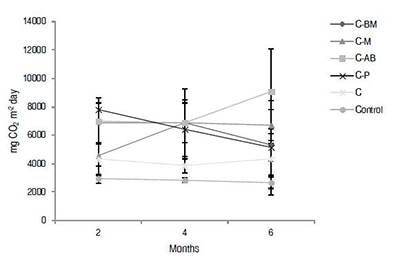 After two months of soil treatment, an increase in soil respiration was found with significant differences (P<0.05) compared to the control in the C-AB, C-BM and C-P treatments. Additionally, it was also observed that C-M and C treatments showed a tendency to increase soil respiration above the control (Figure 1).