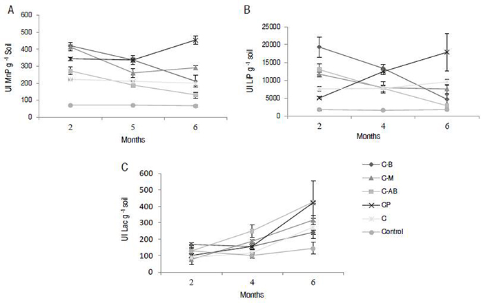 In Figure 2, an early increase is evident in the activity of lignin peroxidase (LiP) and manganese peroxidase (MnP) enzymes in saline-sodic soil after two months of treatment with LRC and CSB. This is possibly due to the LRC properties, characterized by the presence of element that favor the microbial nutrition and development of CSB (Cubillos-Hinojosa et al., 2015). However, LiP and MnP activity cannot be attributed to the effect of the application of CSB, because peroxidase enzyme activities are not known (LiP and MnP) in bacteria. Therefore, this ligninolytic activity may be being performed by fungi found in the microhabitat formed in the porous spaces of the LRC or by native fungi inthe saline-sodic soil. These microorganisms may be being induced to generate LiP and MnP extracellular enzymes that biotransform LRC as described by Fakoussa and Hofrichter (1999).