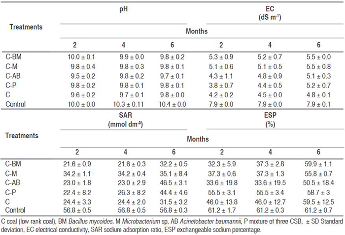 During the 6 months of the experiment, no significant changes in the pH (P<0.05) were generated according to Dunnett's comparison test (Table 3). After two months post-treatment of saline-sodic soil with the LRC and CSB, the EC of soil decreased in all treatments, showing significant differences (P<0.05) in some treatments (C-P, C, C-AB, C-M and C-BM) with respect to the control. In the fourth month, the results showed that only the C-P, C, and C-AB treatments maintained significant differences with respect to the control, and in the sixth month a greater decrease in soil EC was found when treated only with LRC compared to the control by significant differences (P<0.05). Therefore, the addition of LRC alone or in conjunction with the CSB inoculum have an effect on the EC of saline-sodic soil, and agrees with that found by Vance et al. (1998), that when applying organic matter with gypsum on the surface of a Natrixeralf soil managed to decrease the EC compared to an untreated control soil.
