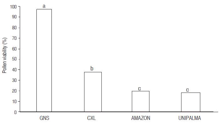 The viability of the pollen grains was determined by genotype: Guinensis presented better viability than the other genotypes, while Coari x Lame was superior to Unipalma and Amazon.
