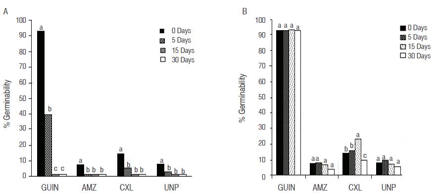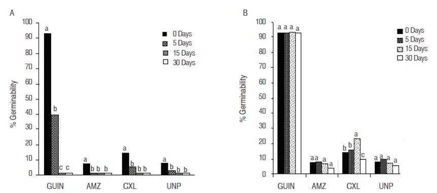 With 15 and 30 days of storage at room temperature no expression was presented, considering that after 5 days of storage, the percentages of germination decrease until the point of not showing any results. These effects show that the storage temperature is an important factor in the expression of germinability, showing that from the first day of anthesis, the pollen shows decreasing percentages proportional to time.