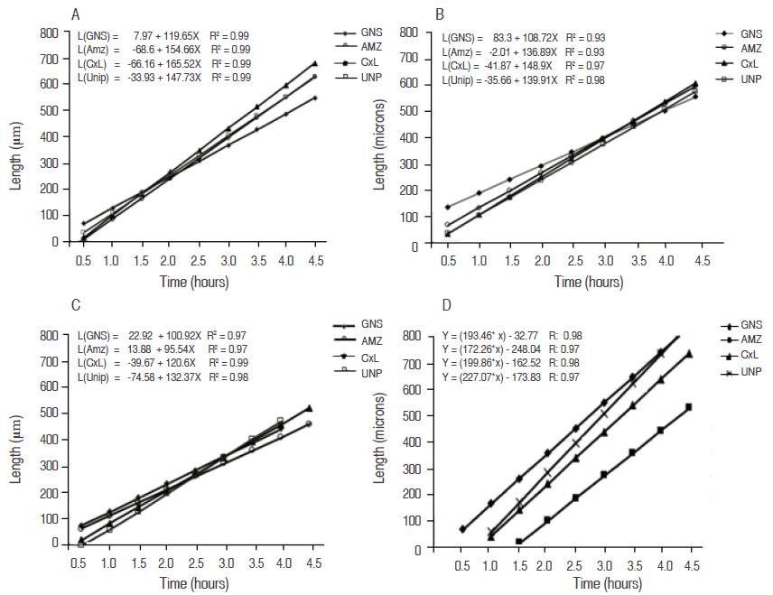 The growth of the pollen tubes of non-stored pollen grains finished between 4.5 and 5 hours, with the genotype Coari x Lame reaching the highest longitude, with 631.82 µm. The genotypes Amazon, Unipalma y Guineensis, reached longitudes of 613.89, 571.43 and 503.21 µm, respectively. All of the genotypes showed lineal growth, proving the vigor of fresh, non-stored pollen (Figure 4A).