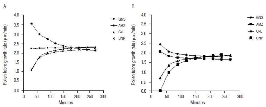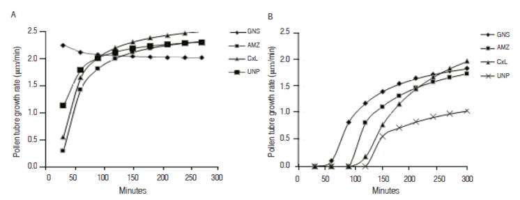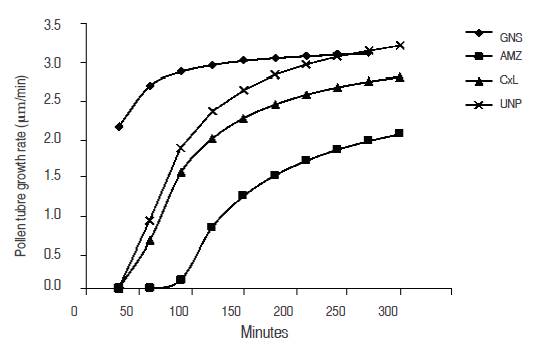The progressive loss observed in growth speed of the pollen tube is a continuous process that involves enzymes that degrade quickly due to environmental factors, and internal factors of each genotype (Dafni and Firmage, 2000).