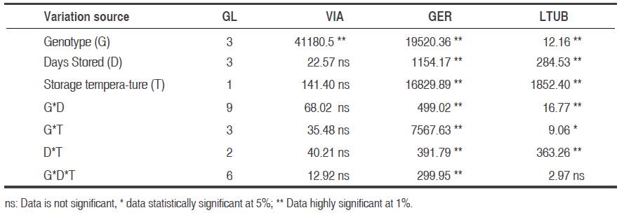 The variables viability, germination and pollen tube length from different oil palm genotypes were significantly affected by temperature and storage time (Table 1).