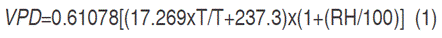 Vapor pressure deficit (VPD, measured in kPa) was calculated from daily temperature and relative humidity recordings according to equation 1 proposed for Rosenberg et al. (1983). The temperature (T) and humidity (RH) values were taken with the thermo-hygrometer (Thermo Hygro and Clock) at every half an hour interval during the day (7:00 to 17:00).
