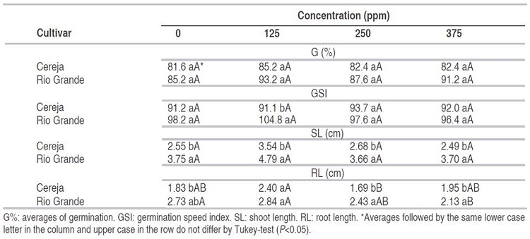 The germination speed index and shoot length of tomato seedlings did not show a significant difference between the concentrations of extract used for either cv (Table 2). Rio Grande presented earlier germination than Cereja.
