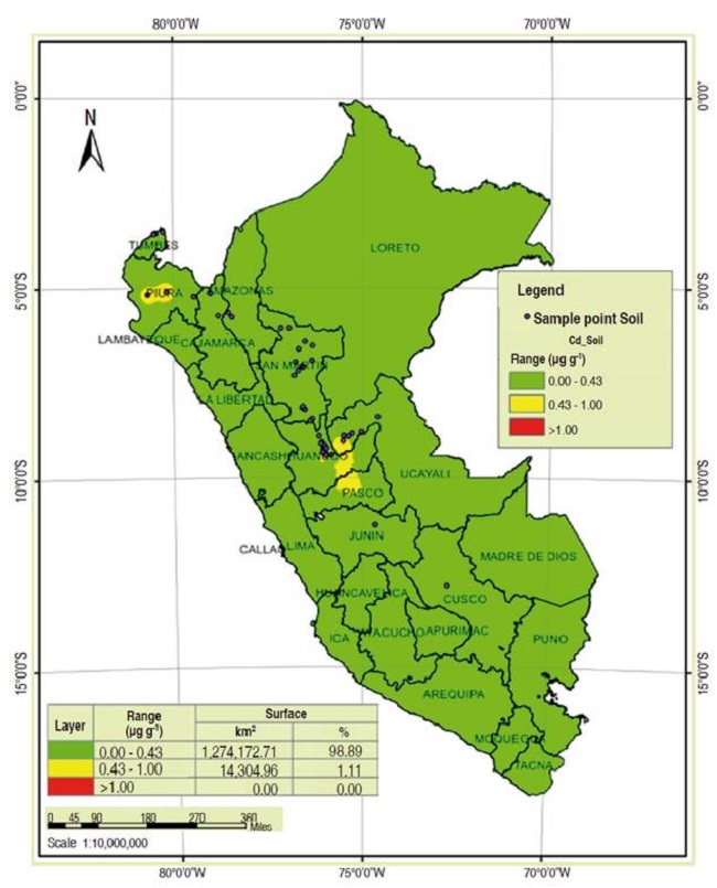 Figure 1, through interpolation, shows the geo-distribution of the levels of available cadmium in soil and that it is determined that 100% of the territory is below the tolerable limit for agricultural soil, as set by Peruvian regulations and only 1.11% approach, but do not exceed EU limits (Kelley Directive); therefore, according to the interpolation, Peru has soil which is intended for cacao production and is not contaminated by cadmium.