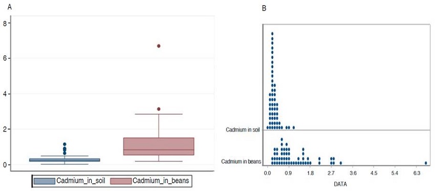 Figure 2A, shows that the average concentration of cadmium in Peruvian soil used for cacao production is 0.29±0.18 µg g-1 and in the beans it is 0.91±0.48 µg g-1, this latter is 3.13 times higher than the value calculated for South America (2.1 times more cadmium in relation to the available cadmium in the soil). Also, when looking at the interquartile range (Figure 2B), 50% of the cadmium in the soil is between 0.02 and 0.23, while in the beans it is between 0.18 and 1.52 µg g-1.