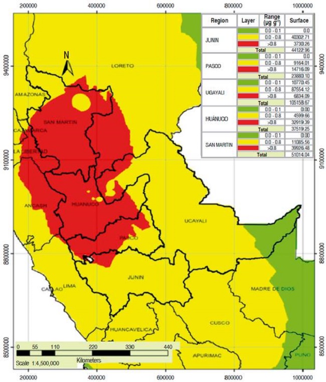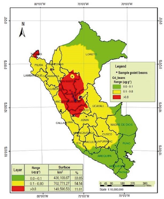 Figure 4 shows geo-distribution by interpolating the total cadmium levels of beans from central Peru: in the San Martin region 78.27% of the total production areas have levels that exceed the limits that are tolerated by the EU, in Huánuco 87.74%, Junín 8.45% and Ucayali 6.49%.