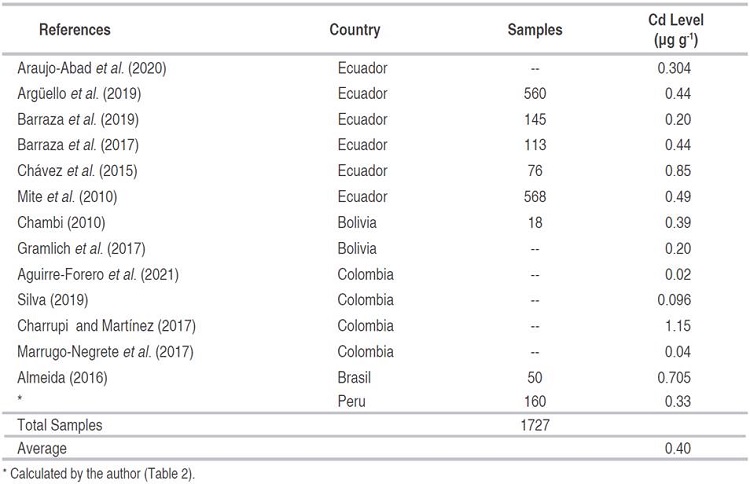 There are reports of high levels of cadmium in the soil of Latin America. Table 1 shows the average of the sampling work that is carried out at regional levels and even at national levels in some countries. The results reveal that on average, South America has 0.42 µg g-1, being categorized as having soil that is not contaminated by cadmium, according to the USEPA (0.43 µg g-1), which has the most stringent regulations established so far for agricultural soil.