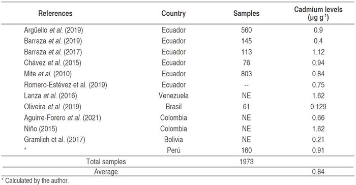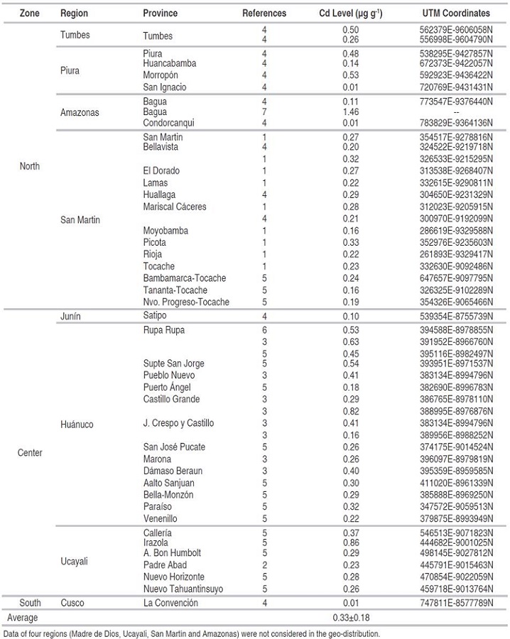 The geo-distribution (Figures 3 and 4) confirms that part of the Peruvian territory (central and northern zone) has beans with cadmium levels, which exceed the limits established by the EU, and similar to Peru, high levels have also been reported in parts of Ecuador (Mite et al., 2010; Chávez et al., 2015; Diaz et al., 2018; Argüello et al., 2019; Barraza et al., 2019), Venezuela (Sánchez et al., 2011; Lanza et al., 2016) , Colombia (Bravo et al., 2014; Jiménez, 2015; Rodríguez et al., 2019), Brazil (Oliveira et al., 2019) and Bolivia (Gramlich et al., 2017) . These countries contributed to world production with 12% in 2012 and 17% in 2019 (Morales et al., 2012; MINAGRI, 2016; Arvelo et al., 2017; Antolinez et al., 2020).