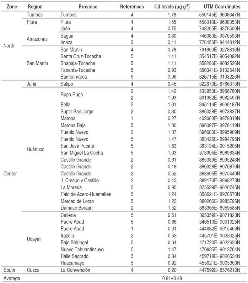 Therefore, in the case of Peru, an uncontaminated soil should have a maximum of 0.36 µg g-1; far below the limits set by the current USEPA standards (<0.43 µg g-1), EU (<1 µg g-1) and by the Peruvian Ministry of Environment (<1.4 µg g-1) (Acevedo et al., 2005; Jiménez, 2015; Pastor, 2017). This would jeopardize the availability of areas for cacao production; however, it would prevent cacao production in heavily contaminated soils (Zug et al., 2019).