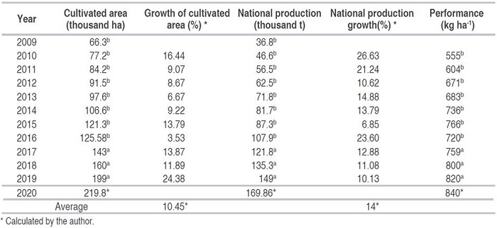Global cacao production increased from 2005-2018 by approximately 800 thousand t; it reached almost 4.6 million (Cunha, 2018). Meanwhile, Ecuador produced, in the same period, 118 to 260 thousand t and went from making up 3% to 6% of the world´s production, becoming fourth among cacao-producing countries, showing an annual growth of 9.8% (Cunha, 2018). Peru also showed sustained growth in cacao, with it being the sixth largest crop, in terms of area, that is harvested in 16 regions, 57 provinces and 259 districts (INEI, 2017). According to Table 5, in the last 10 years the cultivated area has had an annual growth of 10.45%, so that by 2020 it is forecasted to reach an area of 219.8 thousand ha. Also, domestic production has had an annual growth rate of 14% and by 2020 it is forecasted to reach 169.86 thousand t, with a projected yield of 840 kg ha-1; the latter is due to the sustained increase (5%) of the performance, which increased from 555 in 2010 to 820 kg ha-1 in 2019. This is a very positive aspect for Peruvian production, which contributes to approximately 2% of the world´s production and ranks nineth in the world (MINAGRI, 2019).