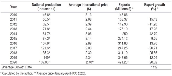 Table 6 shows that in the last 10 years the price has remained relatively steady (ICO, 2020) and Peruvian exports have grown on average by 11%, from 145.86 million in 2010 to 348.66 million in 2019 and a record 421 million can be reached by the end of 2020, as long as prices in the first months of 2020 remain stable (ICO, 2020), despite the validity of the pandemic.