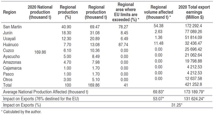 Data interpolation shows that the San Martin, Huánuco, Ucayali and Junín (central zone) and Tumbes (northern zone) regions have areas that exceed the tolerable limits as set by the EU; these areas represent 11.61% of the national territory (Figure 3). According to MINAGRI (2019) (acronym in Spanish) the Tumbes, Ancash and Pasco regions, together with other regions, contribute to only 3% of domestic production; therefore, they are not part of the calculations to measure the effects on future exports.