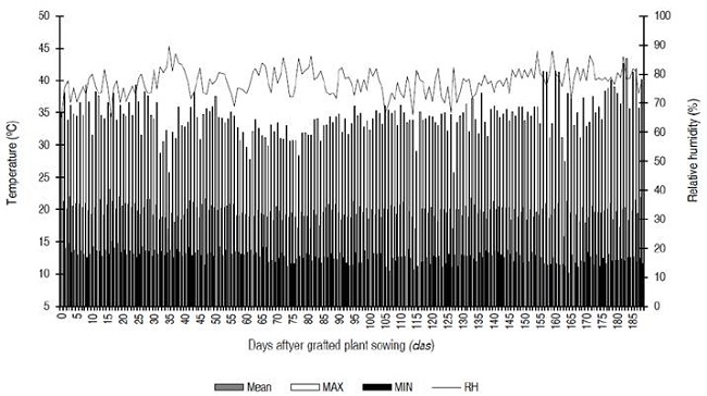 The mean temperature into plastic house fluctuated between 20 and 25 °C, within the optimal range (18 to 25 °C) to develop the crop (Camejo et al., 2005; Heuvelink, 2018). On the other hand, 30 to 40 °C was the maximum temperature reached, and the minimum temperature was between 10 to 15 °C (Figure 1). Regarding relative humidity, mean daily values between 70 and 90% were recorded, which, as indicated by Jaramillo-Noreña et al. (2012), would be above the optimal mean daily values from 50 to 65% of this climatic variable for the crop (Figure 1).